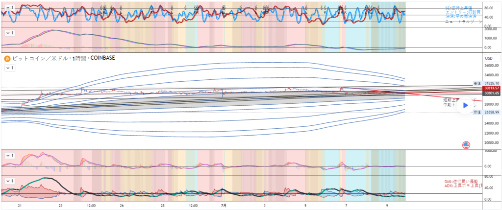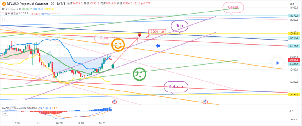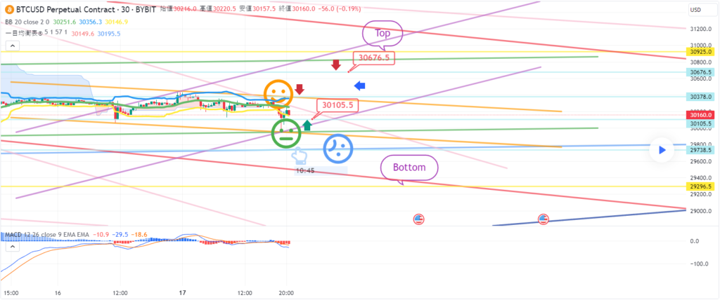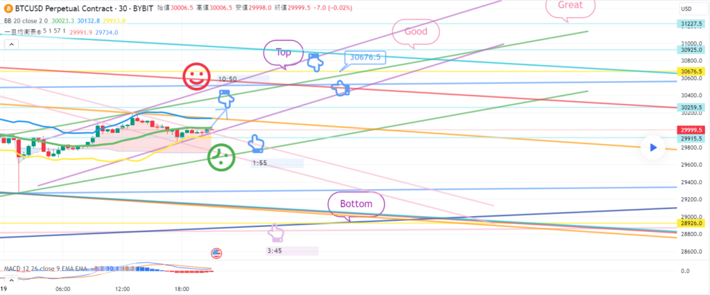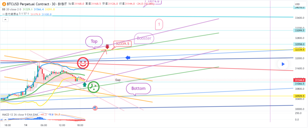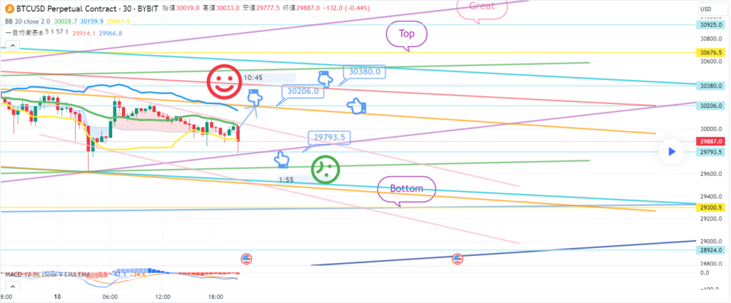 ビットコインの30分チャートです。 ワンウェイロングポジション戦略です。 ナスダック9時30分指標発表 テザードミナンスの主要区間です。 現在の場所から逸脱することなく守っている場合 右上向きで上昇し続けるように見えます。 *空色指移動経路 ショート – >ロングスイッチング戦略 1. 30259.5火ショートポジション入口区間 / 赤色抵抗線突破時の手折り 2. 29915.5火 ロングポジションスイッチング / 緑色支持線離脱時の手折り 30676.5ブルロングポジションターゲット – > Good区間2次ターゲット 横歩きの可能性が高い場所です。 緑色の支持線を離れると、Bottom近くまで追加下落する可能性が高いです。 現地ですぐに下落する可能性もあるため 上部に最初の波動後、戻ってくる支持線の形を見て ロングポジション待機が一番有利に見えます。 私の分析は単に参考にしてください。 原則売買/手折りが必須で安全に運営していただきたいです。 トレード中: 横断しながら今日の戦略が壊れたので リアルタイムでコメントまとめます。 今日は、できるだけ安全な場所でロングポジション戦略を維持しようとしています。 横歩が長く、それだけ分岐点も多いので参考にしてください。 緑色の支持線だけを維持します。 横保障でのみ仕上げても 明日以降、ビットコインは上昇できる条件になります。 現地から上方へのタッチ *空色指移動経路 ショート – >ロングスイッチング(今日の主力区間) 30259.5火ショートレッド赤い抵抗線を突破する手節 -> 29939火 ロングスイッチング 緑色の支持線離脱時の手折り 矢印移動経路29699.5火は2時間チャート支持線 極横保障区間(2時間抵抗線タッチする必要があります) 右下向きの場合、29415ドルまで下落可能性 (ロングスイッチングではなくショートポジションターゲット家庭精度) これからの動きに注目してください。 緑色の支持線の離脱の場合、今週最大27974ドルまで開いています。 動きに応じた明日の復記内容でお会いしましょう。 こんにちは ビットコインガイドです。 7月19日の分析文作成後、動き確認してみます。 ナスダックアナリティクスの作成後の動きです。 主要区間は黒い指で表示しました。 水色指移動経路 15871.4 ショートエントリー-> 下部に水色の支持線付近まで下落後の仕上げ すぐ降りてきたら、パーフェクトが出ることもありましたが残念ですね。 右下に落ちながら、 1+4区間に到達 上部に新しいGapセクションが作成されました。 ビットコイン分析文の作成後の動きです。 主要区間は黒い指で表示しました。 ショート->ロングスイッチングに進んだが、 結局、極横保障後の仕上げ。 入り口のタッチがなかったので 戦略はキャンセル処理。 テザードミナンスが思った以上に耐えますね。 しかし、視点は昨日と同じです。 昨日の夜明け6時間サポートライン – > 今日ボリンジャーバンド1時間チャートサポートラインに触れたので 今日も簡単ではない戦いになるように見えますが。 免責事項 : 本サイトは当ページのいかなるコンテンツや製品も推奨していない。本サイトは世界中他言語グローバルブロックチェーンサイトから引用したすべての重要情報を提供することを目的にしています。読者は上述の内容に関係したあらゆる行動をとる前に独自の調査を行い、自身の決断については全責任を負わねばならない。また、当記事は投資や金融商品購入のアドバイスではない。内容を参考としてご自由にご利用ください。