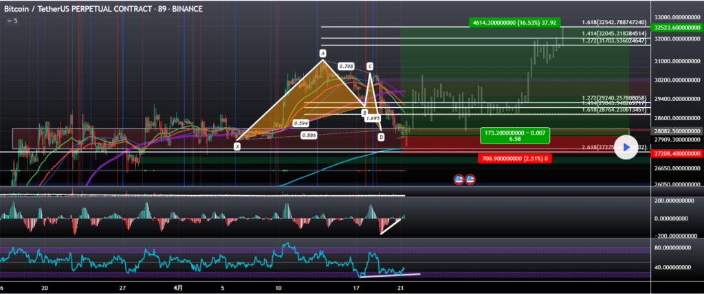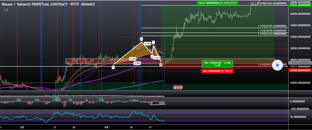 ビットコインはサポートゾーンの底まで下落し、完全な0.886のローカルリトレースを達成しました。この結果、0.382のマクロリトレースも行われ、ABCDパターンのターゲットにより、ビットコインは2.618のフィボナッチ拡張子である約37,500ドルまで上昇する見込みです。 さらに、RSIもオーバーセルゾーンから抜け出し始めており、ここからはブルッシュコントロールゾーンに再び入ろうとする動きが見られるかもしれません。 免責事項 : 本サイトは当ページのいかなるコンテンツや製品も推奨していない。本サイトは世界中他言語グローバルブロックチェーンサイトから引用したすべての重要情報を提供することを目的にしています。読者は上述の内容に関係したあらゆる行動をとる前に独自の調査を行い、自身の決断については全責任を負わねばならない。また、当記事は投資や金融商品購入のアドバイスではない。内容を参考としてご自由にご利用ください。