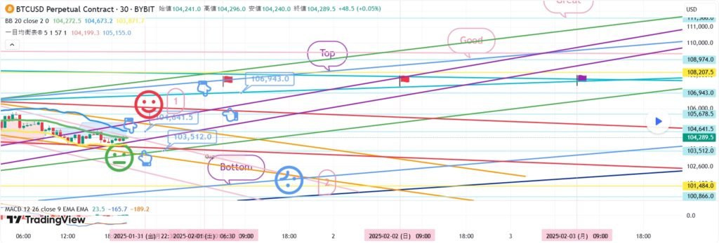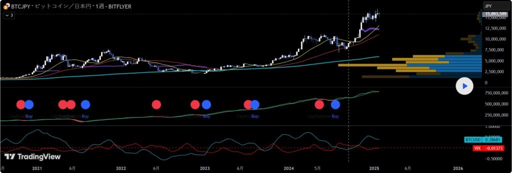 値動きを当てるのではなくサイクルを重視しています 2/01 コメント ●TikToKをイーロンマスクが買収なら、テスラ株かBTCの大量売却があると思います ●USD:レジ/サポライン 89000/92500/98500/105000/108000/113500 ●週足RSIは90%を超えていないので伸びる余地あります ★雲のネジレ:為替含む,前後で動きます ①2/6.2/15 BTC F&G 76↑ 80から90以上売り場の可能性あり 20以下買い場の可能性あり10は底に近い ●予想 A強気 B普通 C弱気です (BTCはボラが激しいので7月に更新します) 重要なライン:12260000円(為替変動あり),80000ドル,割ると下降トレンドに入ります ●週間足 左:JPY,BITFLYER 右:USD,COINBACE 週足:JPY PIVOT○ ichimoku◎ MACD◎ RSI◎ 上昇トレンド USD COINBACE 左:日足 右:4時間足 左:10年間の平均騰落率(注意 年数が浅いので参考にはならない場合あり) 週末に記録 BTC F&G 黄色 25以下 青色 20以下 赤色 10以下 緑88以上 ●投稿時:F&G 76 右:ハッシュリボンと窓 基本的に右肩上がりなので、下の窓は埋まらない場合があります ハッシュリボン Buy:日足○ 週足○ 月足○ MA200 Buy:日足○ 週足○ VIX:日足○ 週足○ 月足○ 注意 横横が続く場合、シンプソンになる可能性が高く大きく下や上に動く 週足MA200以下は、株の投資家は離れるので上がりにくいです ハッシュリボンは一時的な点灯はあるので注意してください チャートは、基本的に右肩上がりなので、下の窓は埋まらない場合がある BTCは、米国指数:NASDAQ100に左右される場合があるので注意 免責事項 : 本サイトは当ページのいかなるコンテンツや製品も推奨していない。本サイトは世界中他言語グローバルブロックチェーンサイトから引用したすべての重要情報を提供することを目的にしています。読者は上述の内容に関係したあらゆる行動をとる前に独自の調査を行い、自身の決断については全責任を負わねばならない。また、当記事は投資や金融商品購入のアドバイスではない。内容を参考としてご自由にご利用ください。