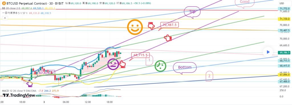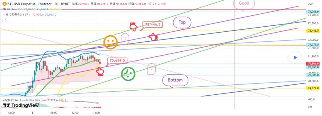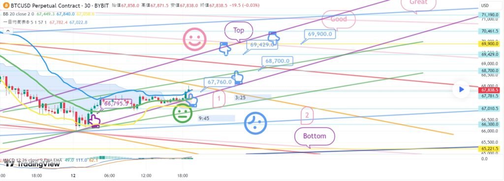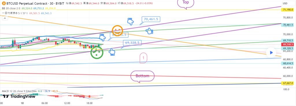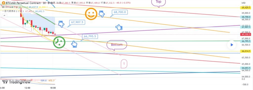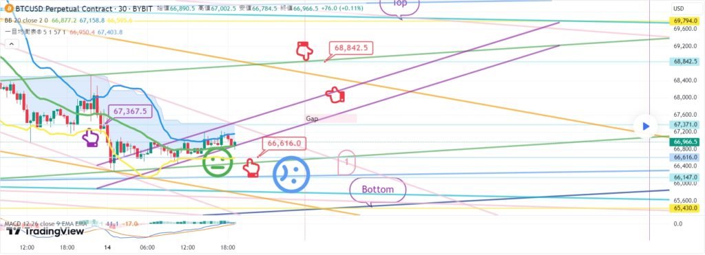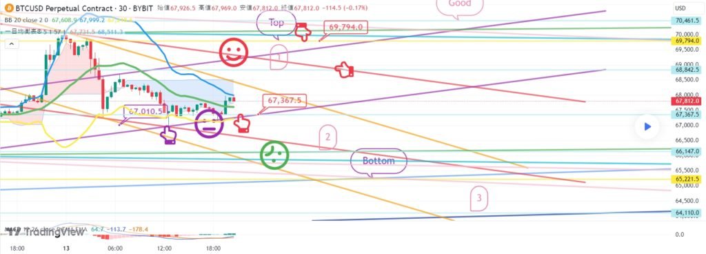 ビットコインの30分チャートです。 今日ナスダック指標発表はありません。 ナスダックは高点更新中です。 ビートはずっと右下向きに震えています。 今日追加の主棒、 ベストショットポジションが出てくれて、 引き続き調整中です。 先週はCPI、FOMC戦略で ロング – >ショート – >ロング最後にロングポジションをつなげて頑張っていたら 今日からは新たにポジションをつかみましょう。 下部に3番区間今週最終調整座63734火を控えて 少し危険な場所で 双方向ニュートラル戦略を持ってきました。 *空色指移動経路 双方向ニュートラル戦略 ロング ->ショートスイッチング戦略です。 1. 65507火 ロングポジション入口区間 / 水色支持線離脱時の手節街 2. 67739.5火ショートポジションスイッチング/赤色抵抗線突破時の手折り 水色の支持線の離脱から ピギーするとすぐに3番区間とつながることができます。 ロング待機中の方 個別に手節が活用しなければなりません。 下部にGap区間65755.5火を中心に 緑色支持戦 / オレンジ抵抗線1番区間まで ポール横保障を接続することができます。 水色の支持線を離れる場合 今週は3区間で63734ドルで 最後の勝負だと思うと楽だと思います。 原則売買、手折が必須で安全に運営していただきたいです。 6月 18 手動でトレードを終了しました: こんにちは ビットコインガイドです。 6月17日分析文作成後、動き確認してみます。 ナスダック30分チャートです。 主要区間は黒い指で表示しました。 水色の指19587.1ロングスタンバイ戦略で 紫色の支持線付近表示した1番区間 / 19649.7 タッチ後 上部にトップ – >グッド – >グレートターゲットが到達。 垂直上昇仕上げになりました。 最近のトレンドは入り口を与えません。 聞かないで上昇が進行中です。 昨日の動きで中期シグナルは また上昇傾向、ボリンジャーバンド中央線付近で 横歩中です。 ビットコインの30分チャートです。 主要区間は黒い指で表示しました。 水色の指ロング – >ショートスイッチング戦略中 下部に65507ドルロングポジションロングポジション入り後、 水色の支持線の離脱がそのまま表示した1番区間タッチ 残念ながら、上部に67739.5ドル ショートポジション進入区間タッチ失敗。 オレンジ色の抵抗線を突破できない そのままBottom区間をもう一度タッチしました。 尾が長く伸びたが、 水色の支持線を離れることなく維持中です。 視点は昨日と完全に同じです。 エントリーポイントまでは届かなかったが まだ進行中であり、 作図や戦略だけを見たとき リアルタイムでロング – >ショート – >ロングスイッチング動作が可能なため 戦略は手動清算処理。 代わりに別にライフラインはなくコメントつなげれば、 *現在区間から全底点離脱時、 今週の最終ロングポジションエントリー価格は下段に3番/ 63734ドルになります 現地で反騰する場合、67739.5火からショートです。 昨日と完全に同じですか? 詳細は午後の分析記事で 解いてみましょう。 6月 18 トレード稼働中: ビットコインの30分チャートです。 復記内容を残した後、リアルタイムポジションです。 視点はそのままです。 上がるとショート – >降りるとロング 水色の指65507火ロング – > 1番区間のショート移動後 Bottom […]