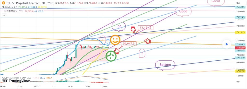 ビットコインの30分チャートです。 ナスダック指標発表はありません。 ナスダック偶像香横保障戦略課 テザードミナンス垂直下落の可能性に応じて戦略を作成しました。 *赤い指の移動経路 ロングポジション戦略 1. 70947.5火 ロングポジション進入区間 / 緑色支持線離脱時の手節街 2. 73151.5ブルロングポジション1次ターゲット -> Good 2次ターゲット -> Great 3次ターゲット Greatの場合は、チャートをドラッグして確認することができます。 上部に表示した1番区間は タッチするほど有利です。 タッチ後すぐに強く撃つことができます。 損益費を取ったときも無理でショートよりは ロング待機が有利に見えます。 下の2番目の区間は短期パターンが壊れる場所です。 押されると、次の支持ラインはボトムになります。 ここまで、私の分析は単に参考にしてください。 原則売買、手折が必須で安全に運営していただきたいです。 5月 22 トレード稼働中: こんにちは ビットコインガイドです。 5月21日分析文作成後、動き確認してみます。 ナスダック30分チャートです。 主要区間は黒い指で表示しました。 水色の指ショート->ロングスイッチング戦略で 上部にショートエントリータッチなし ピンク色の抵抗線を突破せず、 下部に水色の指18613.8ロングポジション入口区間を先にタッチ その後、オレンジ色の抵抗線を突破しながら 全高点突破が行われた。 現在ボリンジャーバンドの下に最初に触れた後 12時間チャートMACDデッドクロスを含む 全体的に下落シグナルが進行中です。 詳細は分析文で一緒に解いてみます。 ビットコインの30分チャートです。 主要区間は黒い指で表示しました。 上部に表示した 水色指1番区間71480.5火 下落波動区間から 赤い指70947.5ブルロングポジションスイッチング戦略で そのまま右下向き横歩 下段に表示しておいた2番区間69641ドル横補間までタッチしました。 大きく離脱せず、右下向きに徐々に横歩中だから まだ2区間でロングポジションを維持している人 たくさんあると判断しました。 席もよく耐えているので、2番区間から 戦略はアクティブタッチです ライフラインを残します。 短期パターンは壊れた状態ですが、 ナスダックでは全高点を突破しました。 一度にBottomまたは1+4区間まで降りてこなかったので 十分に耐えるだけだと判断されます。 5月 22 トレード稼働中: ビットコインの30分チャートです。 リアルタイムライフラインです。 紫色の指69641ブルロングポジション粒子 2番区間そのまま接続して持ってみました。 4時間チャートMACDデッドクロスが刻印されました。 まだ優しい場所だから ロングポジションを持っている人は緑色の支持線を離れるか 手節が目安に見守ってください。 上段の1番区間は短期ターゲットとショートポジション運営区間 下部に2番 -> Bottom区間は追加支持ラインです。 免責事項 : 本サイトは当ページのいかなるコンテンツや製品も推奨していない。本サイトは世界中他言語グローバルブロックチェーンサイトから引用したすべての重要情報を提供することを目的にしています。読者は上述の内容に関係したあらゆる行動をとる前に独自の調査を行い、自身の決断については全責任を負わねばならない。また、当記事は投資や金融商品購入のアドバイスではない。内容を参考としてご自由にご利用ください。