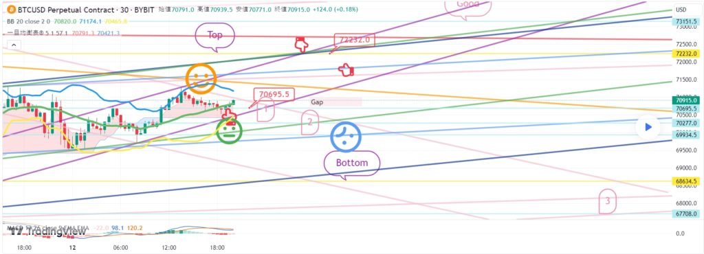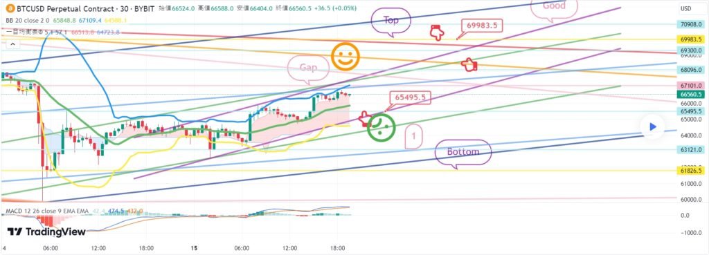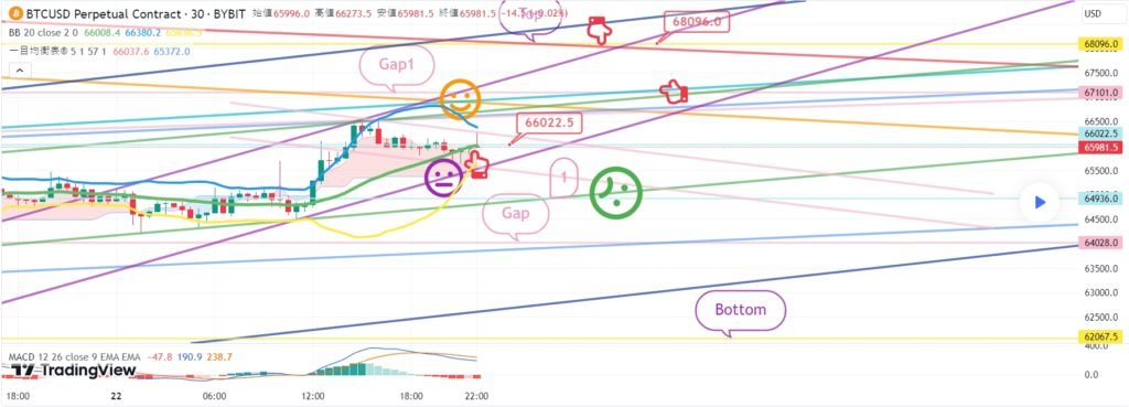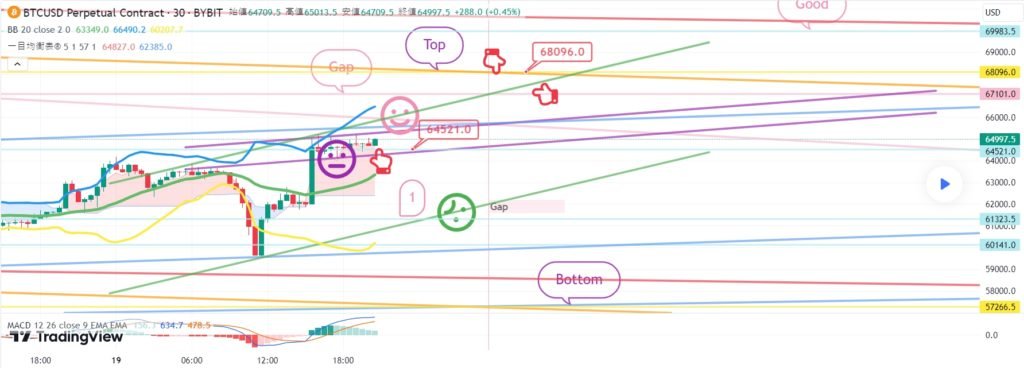 ビットコインの30分チャートです。 今夜10時45分、11時ナスダック指標発表があります。 ナスダックは絶えず混乱している状態です。 ビットの場合、4時間チャートMACDデッドクロスが押されています。 主要パターンに従って戦略を作成しました。 *赤い指の移動経路 ロングポジション戦略 1. 65288.5火 ロングポジション進入区間 / 水色支持線離脱時の手節街 2. 1番区間 66828火 ロングポジション 1次ターゲット -> Top区間 67680火 2次ターゲット 下部に2番区間はボリンジャーバンド6時間中央選定度になるが この区間タッチなしですっきり1+4で上げるとベストです。 水色のサポートラインタッチからはさらに下落する可能性があります。 下部にGap区間近くまで開いてください。 ここまで、 原則売買、手折が必須で 安全に運営してほしい 4月 23 トレード稼働中: ビットコイン30分チャートリアルタイムです。 今日のベストショット入り口が出ました。 紫色の指66519火から表示していた1番区間までタッチしました。 ショートに入る方は手節が運営上手です。 ナスダックに好材料が出てきて、ビットも反騰しています。 今日ボリンジャーバンド2時間チャート中央線タッチ 3時間チャートMACDデッドクロス刻印灯 垂直上昇の可能性は少ないが ナスダックとカップリングしながら、ワンボンチャートMACDゴールデンクロスまで 接続されると強く上昇する可能性があります。 ショート運営の方は全高点またはオレンジ色の抵抗線を突破するか 4月 24 手動でトレードを終了しました: こんにちは ビットコインガイドです。 4月23日分析文作成後、動き確認してみます。 ナスダック30分チャートです。 主要区間は黒い指で表示しました。 赤い指17245ロングエントリー後 17413ショートスイッチング区間を無視して そのまま17543.8ターゲットが到達 11時、指標発表に好材が出てきて強い反騰で仕上げられました。 昨日の動きでボリンジャーバンド4時間チャート抵抗線をタッチしました。 下部に 17514.7 新しい Gap 区間が作成されました。 主棒チャート中央線までキャンドルが回復しました。 詳細な内容は今日の分析文で一緒に解いてみます。 やはりすごいナスダックです。 ビットコインの30分チャートです。 主要区間は黒い指で表示しました。 昨日は赤い指65288.5火ロングスタンバイ戦略だったが 入り口まで降りないで 上部に表示した1番区間66828火 / 紫指66519火タッチ後 紫色の支持線毀損まで極横保障仕上げです。 オレンジ抵抗線/紫色支持線収束区間 横歩しながら反騰が続いています。 リアルタイムでショートポジションを運営している人もいます。 戦略は手動清算処理。 現地で4時間チャートMACDデッドクロス刻印なし すぐに上昇することもありますが。 リアルタイムライフラインを残してすぐに分析文を進めます。 4月 24 トレード稼働中: ビットコインの30分チャートです。 リアルタイムライフラインです。 買っている人 上部に紫色の指66828 オレンジ色の抵抗線を突破する手節 下部に65900ドルのロングポジションスイッチング区間を残しました。 免責事項 : 本サイトは当ページのいかなるコンテンツや製品も推奨していない。本サイトは世界中他言語グローバルブロックチェーンサイトから引用したすべての重要情報を提供することを目的にしています。読者は上述の内容に関係したあらゆる行動をとる前に独自の調査を行い、自身の決断については全責任を負わねばならない。また、当記事は投資や金融商品購入のアドバイスではない。内容を参考としてご自由にご利用ください。