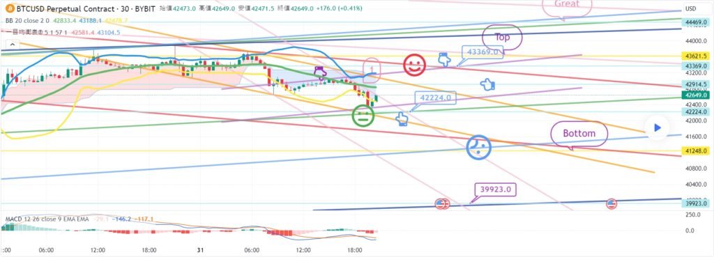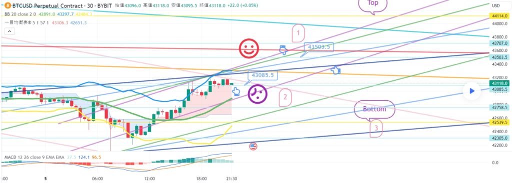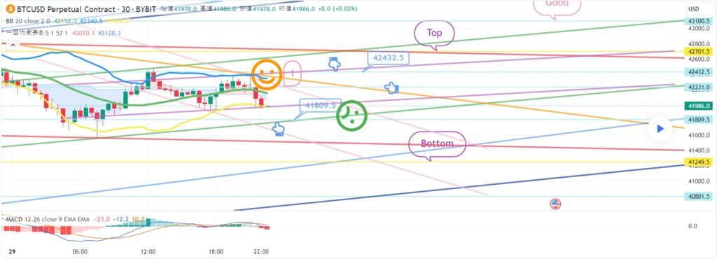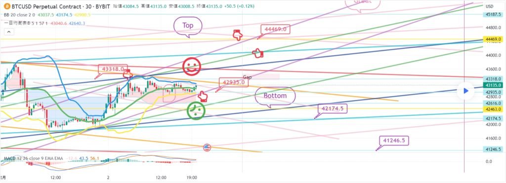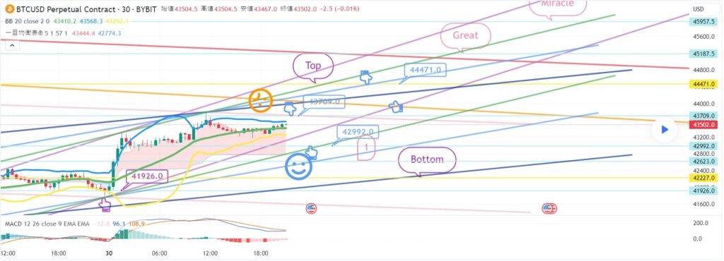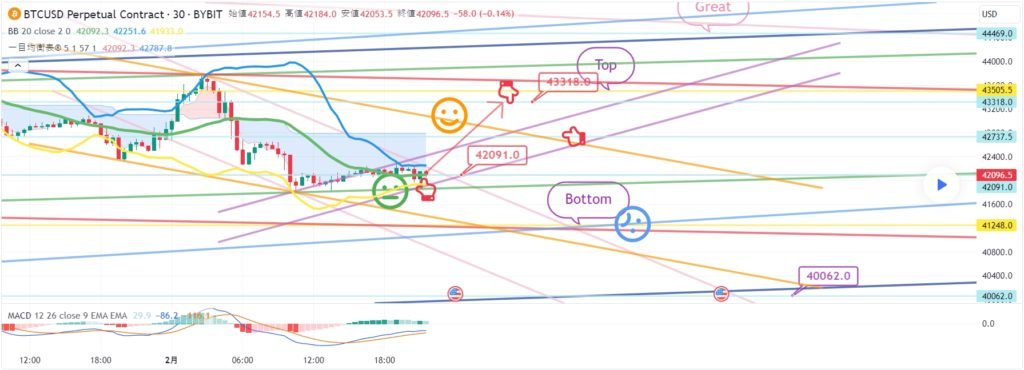 ビットコインの30分チャートです。 一日中精神がなくて分析の進行がうまくいったのかわかりません。 今夜12時ナスダック指標発表しています。 ビットコインは午後にGapが戻った後 横歩中ですが、今日も難易度が相当です。 テザードミナンス垂直下落条件で戦略を進めました。 途中で変数部分も残しました。 丁寧にチェックしてみるといいと思います。 *空色指移動経路 双方向ニュートラル ロング – >ショートスイッチング戦略です。 1. 43085.5火 ロングポジション入口区間 / 紫色支持線離脱時の手節街 2. 43503.5火ショートポジションスイッチング/赤色抵抗線突破時の手折り 上部に表示した1番区間は 最終ショットポジションスイッチング区間 突破する場合、Top区間まで上昇することがあります。 下部に2番区間は横保障 Bottom->3番区間は順番に支持ライン区間です。 今週揺れながら横になっても 主棒チャートMACDデッドクロス刻印が完了するように見えます。 みんなで頑張って、運営上手にしてほしいです。 ここまで、私の分析文は単に参考にしてください。 原則売買、手折が必須で安全に運営していただきたいです。 トレードは手動で終了しました: こんにちは ビットコインガイドです。 2月5日の分析文作成後、動き確認してみます。 ナスダック30分チャートです。 主要区間は黒い指で表示しました。 赤い指17619.8ロングエントリー後 下落波動発生 – >下段に表示していた2番区間タッチして 極横保障仕上げ。 時間帯を確認してみると、 12時の指標発表で悪材が出たようです。 シグナルやパターンで問題はありませんでした。 全高点突破基準でずっといたずらをしています。 ビットコインの30分チャートです。 主要区間は黒い指で表示しました。 ロング->ショートスイッチング戦略で 水色の指43085.5火ロングポジション入口区間 10ドル差でタッチ失敗。 上部にショートポジション入口区間43503.5火タッチ 下段に表示した3番区間の真青支持線で反灯中です。 最初のロングエントリータッチはありませんでしたが ショートエントリー位置はうまく合っています。 戦略は手動清算。 難しい場所でラッキーに半分が当たっています。 ワンウェイは本当に難しいようです… 昨日は12時間チャートMACDデッドクロスプレッシャーがありました。 今日刻印まで完了しました。 主棒チャートMACDデッドクロスプレス ずっと振ってくれるようです。 今日もよく勝ちましょう。 トレード中: ビットコイン30分チャートリアルタイムライフラインです。 メインセクションを表示しました。 活用すればいいと思います。 トレード中: 作図以降のリアルタイムの動きです。 ボリンジャーバンドの上部に最初に触れました。 緑色の支持線内で横歩中です。 免責事項 : 本サイトは当ページのいかなるコンテンツや製品も推奨していない。本サイトは世界中他言語グローバルブロックチェーンサイトから引用したすべての重要情報を提供することを目的にしています。読者は上述の内容に関係したあらゆる行動をとる前に独自の調査を行い、自身の決断については全責任を負わねばならない。また、当記事は投資や金融商品購入のアドバイスではない。内容を参考としてご自由にご利用ください。