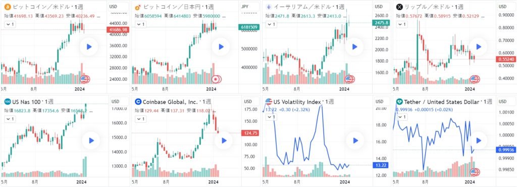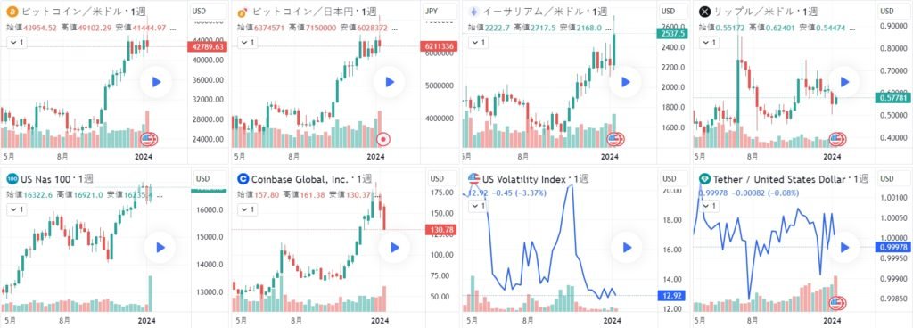 ビットコイン半減期の翌年にバブルを繰り返すというパターンが本当なら、次回半減期2024年の翌年2025年が大幅上昇の年となります。もう少し先の話ですね。 さて、2021年後半から2023年現在までのビットコインを俯瞰します。 【2021年末~2022年1月】 2021年11月の高値69000ドル付近(2021/11/10)から、2022年1月の安値33000ドル付近(2022/1/24)まで約50%の下落でした。 【2022年2月~5月】 2月は月の前半こそ上昇したものの、後半はロシアのウクライナ侵攻で金融市場が混乱するのと歩調を合わせるように、ビットコインも下落基調。その後3月は一旦48000ドルまで戻す場面(2022/3/28)もありましたが、4月は下落、5月は30000ドルを挟んでもみ合い膠着状態でした。 【2022年5月~8月】 そして5月末一旦上昇を見せたものの、6月に入ってまた下落が加速、20000ドルも割ってきました(2022/6/18以降)。世界の金融市場も金利とリセッション(景気後退)が市場のテーマとなり、リスクオフが続きます。 【2022年9月~12月】 低空飛行のまま9月と10月と膠着状態が続いていました。10月の終わりからやや上昇気配も見せていましたが、11月2週目FXT破綻をきっかけに、米株が上昇するのとは反対に暗号資産は急落。6月の安値17525ドル(6/18)も抜け、15460ドルの安値(11/21)を付けました。 【2023年1月~3月】 2023年に入ってビットコインの流れが変わってきたようです。 2022年末の16000ドル台から、2月半ばには25000ドルを突破、さらに3月の銀行危機を受けてビットコインと金が上昇、一時ビットコインは28000ドルに届きそうな勢いでした。 【2023年4月~6月】 金融システム不安が和らぐなか、4月に入りビットコインの動きはやや停滞した後ついに30000ドルを一時突破しましたが、その後失速、5月は27000を挟んでもみ合いが続きました。 しかし、6月に入って米国の暗号資産規制リスク懸念で徐々に下げていたところ、一転現物ETFへの期待買いから上昇に転じています。 【2023年7月~9月】 6月半ば、SEC対リップル社のXRPに関する判決を受けリップルが急騰しました。これを受けビットコインも上昇、その後緩やかに下落したものの、8月初旬27000ドル~28000ドル/あたりから反発を予想する声もチラホラ、実際に上がりそうな気配もありましたが、逆に8/18(金)イーロン・マスクのSpaceXがビットコインを売却したとの報道で暗号資産が急落してしまいました。そして8/29(火)SECによるビットコインETF却下不当の米高裁判決が出て暗号資産が急騰、しかしその後数日で上昇分全戻しとなりました。 【2023年10月~12月】 10月に入ってやや下落基調でしたが同月半ば、中東懸念・地政学的リスクもあり、金と共に仮想通貨も買われ始め、11月にかけて大きく上昇しました。12/5(火)に45000ドルの高値をつけ、42000ドル台で2023年を締めくくりました。 【2024年1月~】 新年1週目はビットコイン陽線でしたが、注目のビットコインETF承認後は下落しています。 1/21(日)19時頃、ビットコインは、BTCUSD41730ドル・BTCJPY618万円付近。 ※1/14(日)19時頃、ビットコインは、BTCUSD43025ドル・BTCJPY624万円付近。 ※1/7(日)19時頃、ビットコインは、BTCUSD43950ドル・BTCJPY636万円付近。 ※12/31(日)19時頃、ビットコインは、BTCUSD42720ドル・BTCJPY603万円付近。 ※12/24(日)19時頃、ビットコインは、BTCUSD43711ドル・BTCJPY623万円付近。 ※12/18(日)19時頃、ビットコインは、BTCUSD41910ドル・BTCJPY597万円付近。 ※12/10(日)19時頃、ビットコインは、BTCUSD43620ドル・BTCJPY633万円付近。 ※12/3(日)19時頃、ビットコインは、BTCUSD39472ドル・BTCJPY580万円付近。 ※11/26(日)19時頃、ビットコインは、BTCUSD37783ドル・BTCJPY565万円付近。 ※11/19(日)19時頃、ビットコインは、BTCUSD36656ドル・BTCJPY549万円付近。 ※11/12(日)19時頃、ビットコインは、BTCUSD37070ドル・BTCJPY562万円付近。 ※11/5(日)19時頃、ビットコインは、BTCUSD35120ドル・BTCJPY524万円付近。 ※10/29(日)19時頃、ビットコインは、BTCUSD34220ドル・BTCJPY512万円付近。 ※10/22(日)19時頃、ビットコインは、BTCUSD29900ドル・BTCJPY447万円付近。 ※10/15(日)19時頃、ビットコインは、BTCUSD26900ドル・BTCJPY403万円付近。 ※10/8(日)19時頃、ビットコインは、BTCUSD27900ドル・BTCJPY417万円付近。 ※10/1(日)19時頃、ビットコインは、BTCUSD27230ドル・BTCJPY406万円付近。 ※9/24(日)19時頃、ビットコインは、BTCUSD26593ドル・BTCJPY395万円付近。 ※9/17(日)19時頃、ビットコインは、BTCUSD26590ドル・BTCJPY393万円付近。 ※9/10(日)19時頃、ビットコインは、BTCUSD25820ドル・BTCJPY382万円付近。 ※9/3(日)19時頃、ビットコインは、BTCUSD25900ドル・BTCJPY379万円付近。 ※8/27(日)19時頃、ビットコインは、BTCUSD26060ドル・BTCJPY382万円付近。 ※8/20(日)19時頃、ビットコインは、BTCUSD26130ドル・BTCJPY381万円付近。 ※8/13(日)19時頃、ビットコインは、BTCUSD29390ドル・BTCJPY426万円付近。 ※8/6(日)19時頃、ビットコインは、BTCUSD29047ドル・BTCJPY413万円付近。 ※7/30(日)19時頃、ビットコインは、BTCUSD29283ドル・BTCJPY413万円付近。 ※7/23(日)19時頃、ビットコインは、BTCUSD29908ドル・BTCJPY424万円付近。 ※7/16(日)19時頃、ビットコインは、BTCUS
