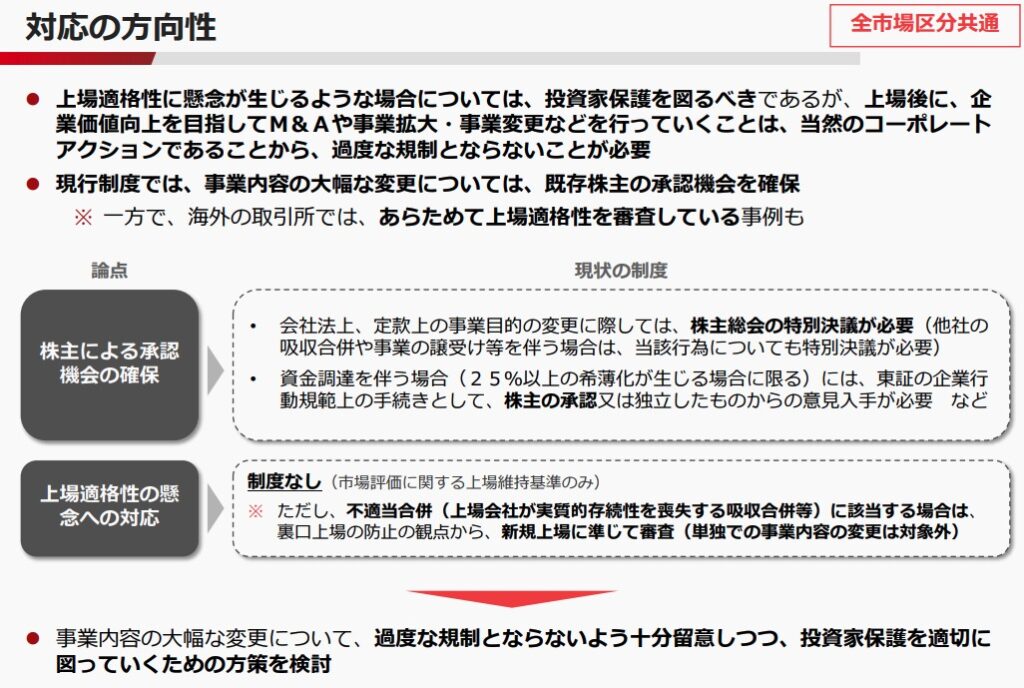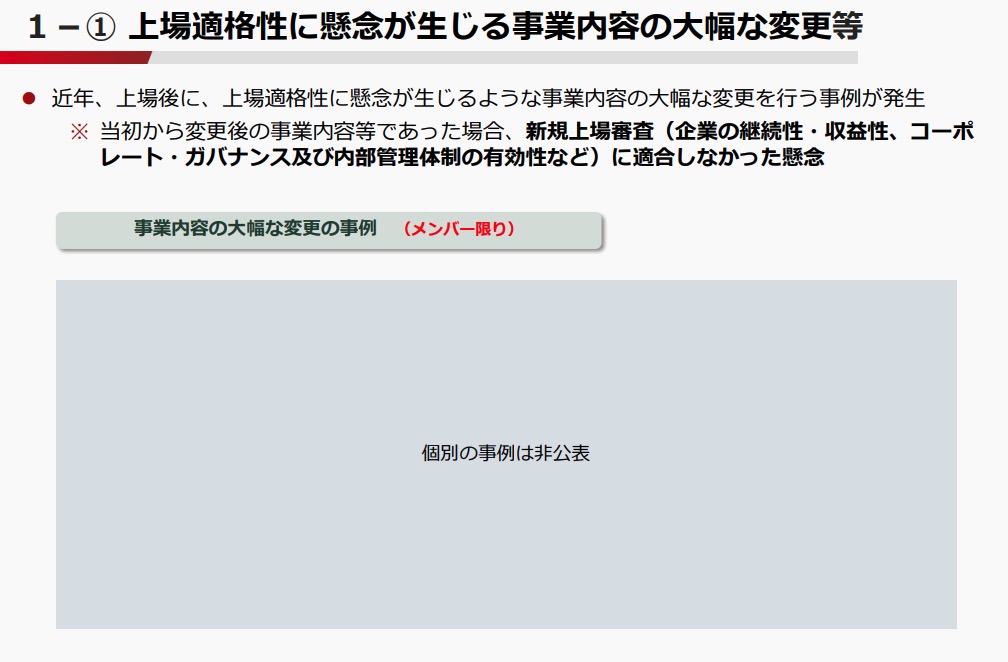 東証の資料によると、近年、上場後に事業内容を大幅に変更する事例が発生しており、仮に当初から変更後の事業内容であった場合、新規上場審査の基準に適合しなかった懸念があることが指摘されている。