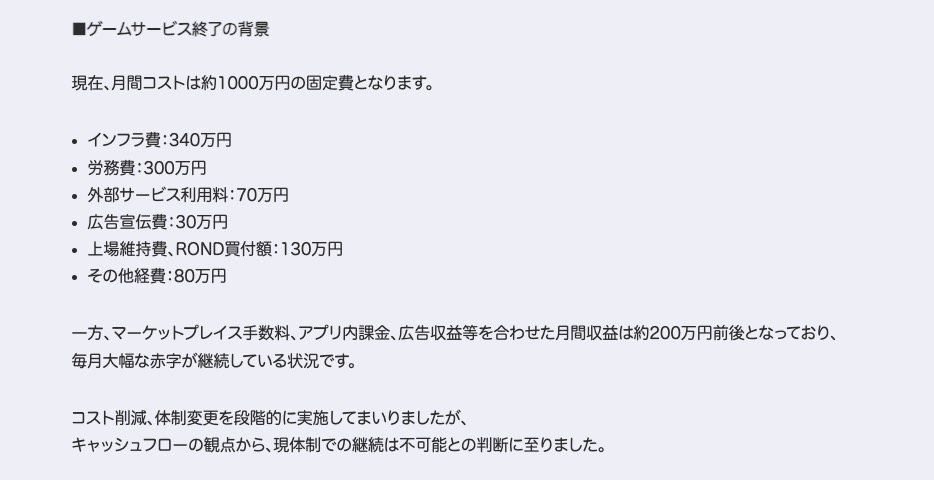 発表によると、インフラ費や労務費を含む月間固定コストが約1000万円発生しているのに対し、アプリ内課金や手数料などの月間収益は約200万円にとどまり、恒常的な赤字状態が続いていたという。